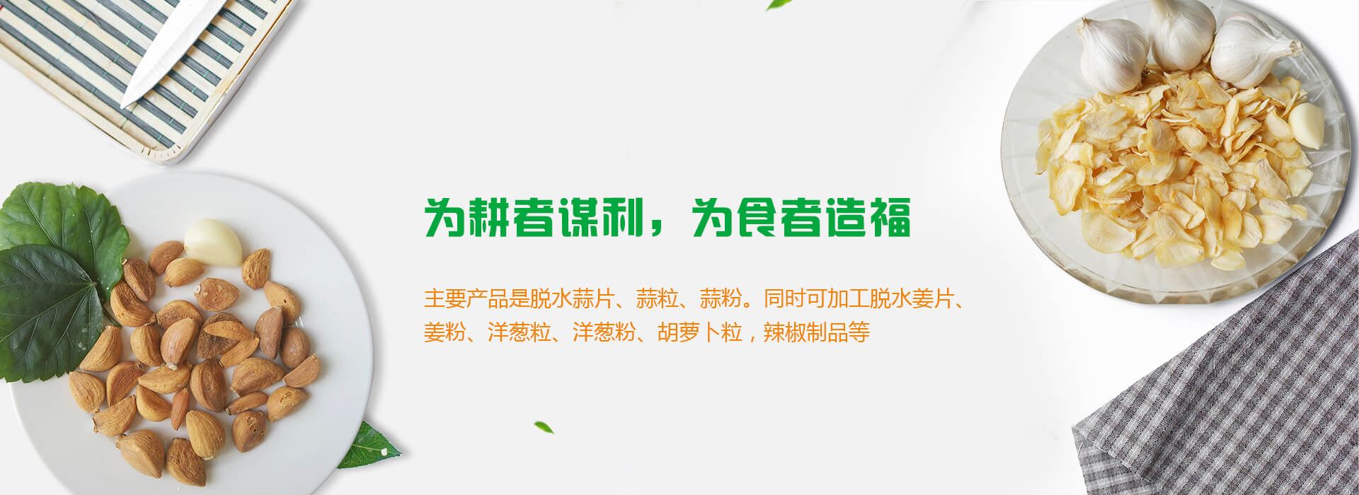 主要产品是脱水蒜片、蒜粒、蒜粉。同时可加工脱水姜片、姜粉、洋葱粒、洋葱粉、胡萝卜粒,辣椒制品等。